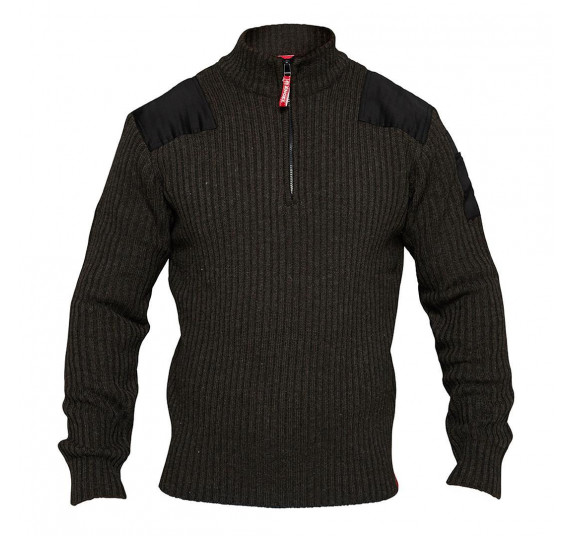 Bequemer Rippstrickpullover mit hohem Kragen und Reißverschluss. Schultern und Ellenbogen sind mit Canvas verstärkt. Tasche mit Einschub für z. B. Stifte am linken Ärmel.